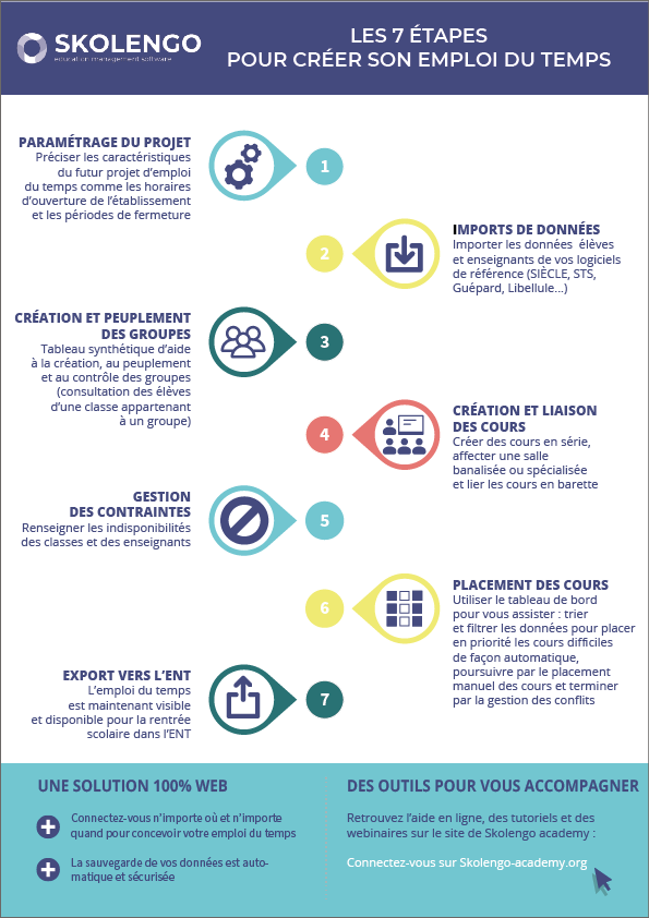 As all School principals and vice-principals know, creating a Timetable can be a real headache! Skolengo's Timetable software guides you step-by-step through the process, in 7 key steps.