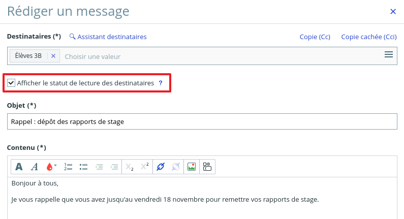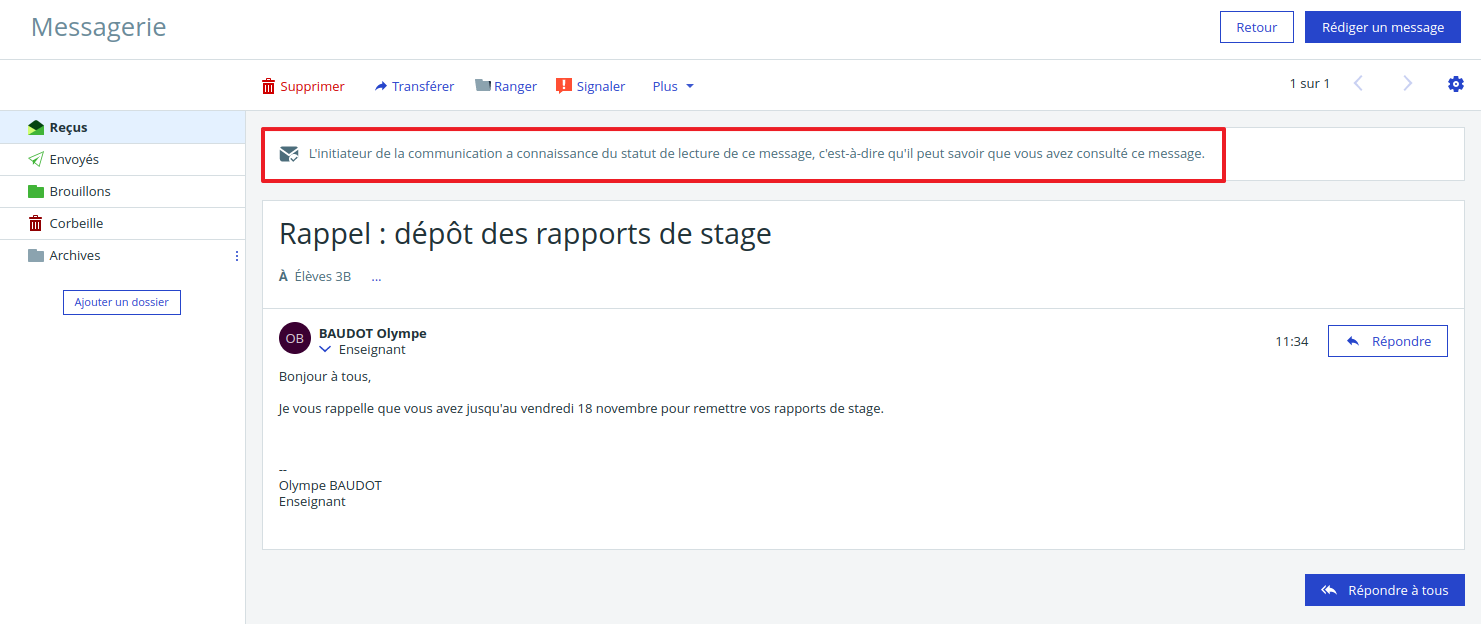 The recipient of the message is informed of the sender's read status in his or her inbox and when the message is consulted.