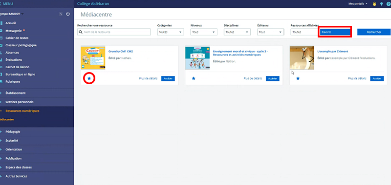 Each Teacher or Student can add to a list of Bookmarks the Digital resources they use and which are available in the ENT Mediacentre. Skolengo. The list can be modified at any time.