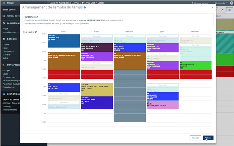 The software offers high-performance, efficient functions for managing the modified timetables of students in ULIS or UPE2A. This makes it much easier to monitor the attendance and Schooling of these students. The software lets you remove a Student from some of his or her regular Course(s) with a single click. The student can then be quickly and easily repositioned for lessons in a different class, with a different teacher, at a different level, or even for a lesson without a group, such as the extra lessons given by a teacher to students in the ULIS system. The same applies to all Timetables for students with PAFIs, for example.