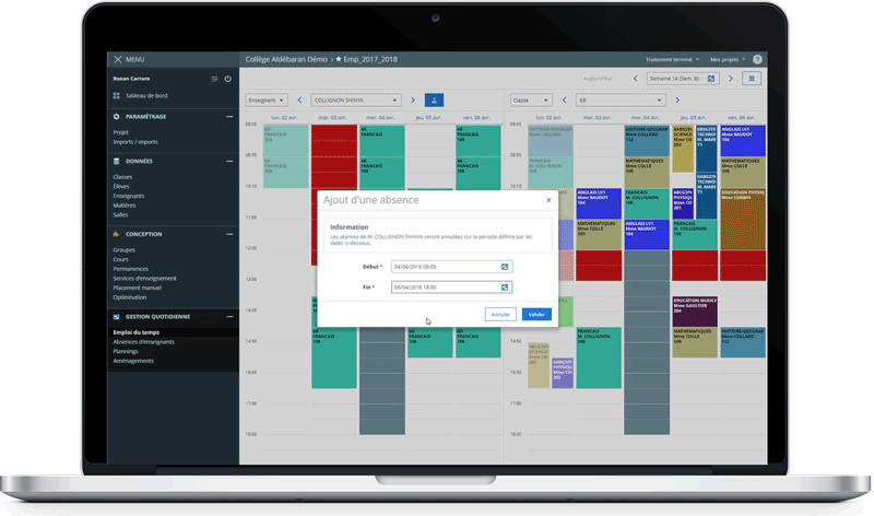 In addition to the ease with which timetables can be drawn up and the functionalities provided for the management of modified timetables, the tool offers fast, efficient management of unforeseen events in its "daily management" section. In the event of a Teacher's absence, one click is all it takes to report the absence, modify the Timetable and propose a short-term replacement. The information is automatically transferred to the Schooling software's Attendance register and call sheets, making it easier to disseminate information to students and families, as well as to other School services.