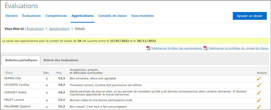 El profesorintroduce las evaluaciones de sus alumnos, divididas por clase o por grupo, con el fin de completar los informes de evaluación para la próxima reunión del consejo de clase.Las evaluaciones pueden introducirse tanto para las clases calificadas como para las no calificadas.