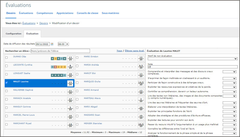 Ll profesor puede crear, ver, modificar, duplicar, evaluar y eliminar deberes. Puede adjuntar respuestasy distribuirlos a alumnos y padres en una fecha de su elección.Desde una única pantalla, los profesores pueden introducir calificaciones Y competencias o indicar un motivo de "no evaluación (como la ausencia de un alumno), introducir una evaluación y consultar la media de la clase.