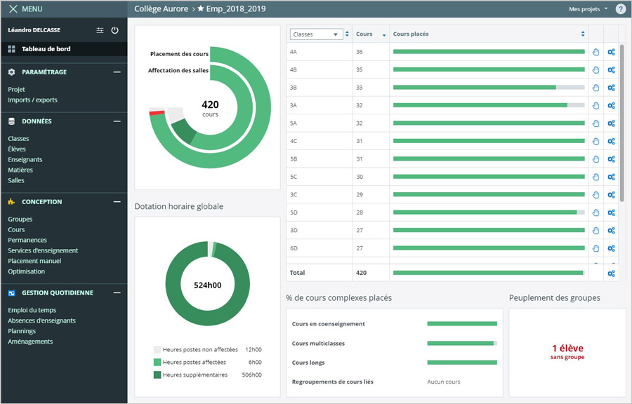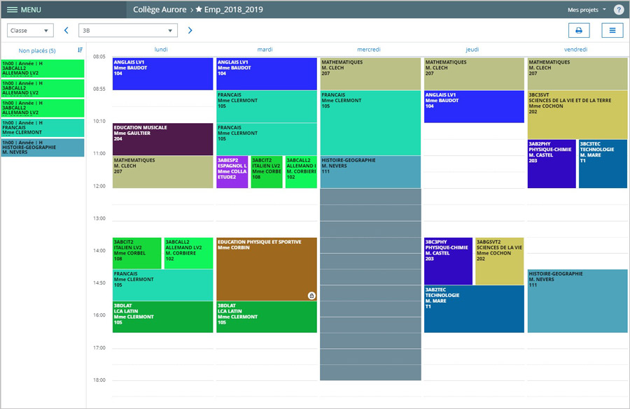 L'a ergonomía sencilla e intuitivadel software de horarios escolares le permite familiarizarse rápidamente con la solución. La presentación lógica del menú principal guía al usuario a través del paso a paso paso a paso.El sitio flexibilidad del módulo significa que el usuario conserva control sobre el diseño del horario para adaptarlo a las características específicas de su centro (gestión de grupos, indisponibilidad de clases y profesores, etc.).