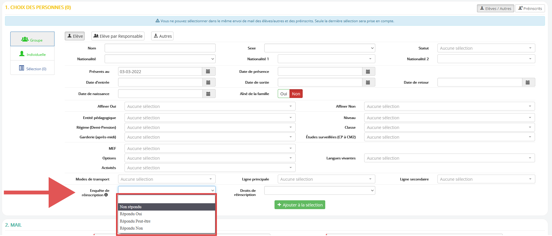 Dans vos envois d’email, un nouveau filtre fait son apparition : « Enquête de réinscription ». Grâce à ce filtre, vous pouvez relancer de manière différenciée les responsables légaux, lors de vos campagnes de réinscription.