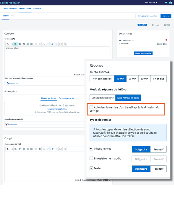 Un enseignant a la possibilité d'accorder la remise d’un travail à faire après la date d’échéance et après la diffusion du corrigé commun. Par exemple, si l'enseignant pratique l'autocorrection comme outil d'apprentissage, il accepte alors la remise du travail après la diffusion du corrigé.3 modes de remise de travail à faire